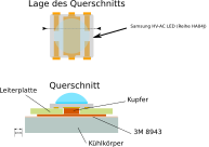 Falk Brunner schrieb: > ... > Vor allem sehe ich nicht den Sinn bei diesen LEDs, diese zu > "vergiessen". Entschuldige meine letzte, etwas aggressive Antwort, aber die hatte ja auch eine Vorgeschichte... Aber um es (nicht nur für dich) noch einmal zu verdeutlichen: Die Lötanschlüsse der LED unterschreiten an bestimmten Stellen die erforderliche Kriechstrecke bei 230V (siehe Abbildung im Anhang). Streng genommen könnte man zwar auch mit den 0,86mm leben, da der Kühlanschluss potenzialfrei sein sollte und im Chip isoliert ist, aber wie stark die Isolation ist, weiß nur Samsung (verrät es aber nicht). Im Fehlerfall (also z.B. beim Versagen der internen Isolation des Kühl-Pads) können die 0,86mm dann schnell mal zu wenig sein. Also möchte ich da noch einen zusätzlichen Sicherheitspuffer haben.