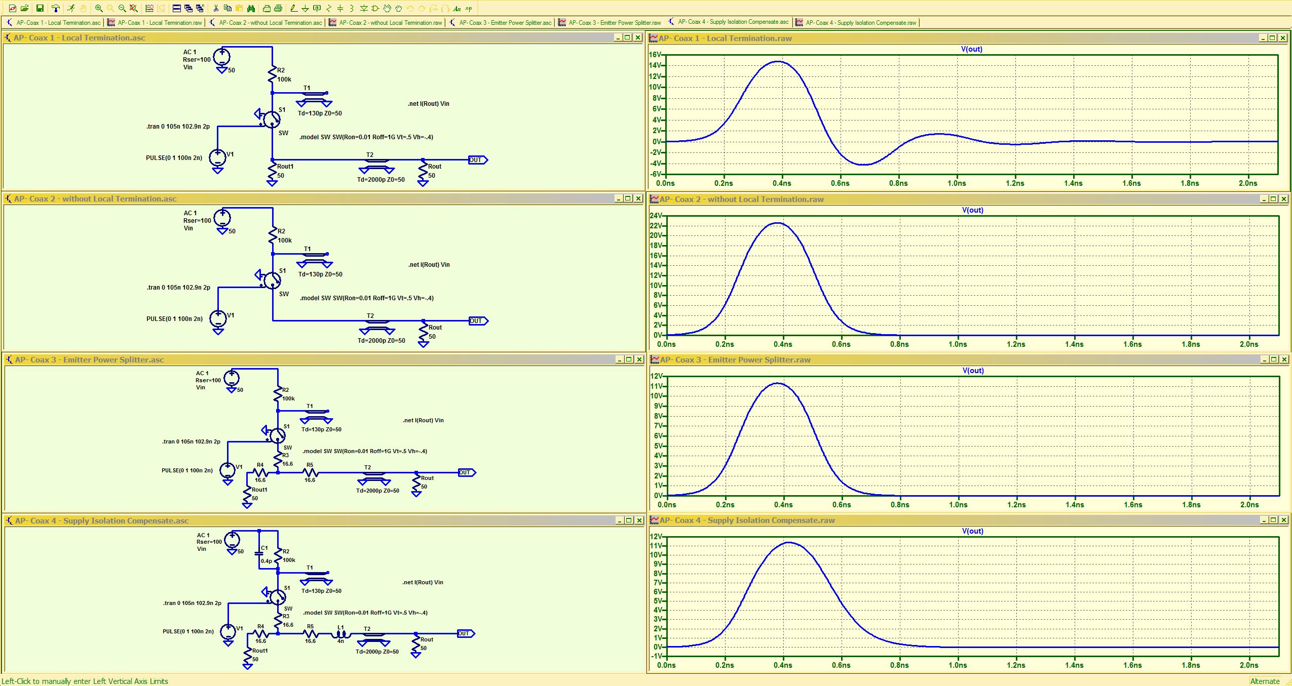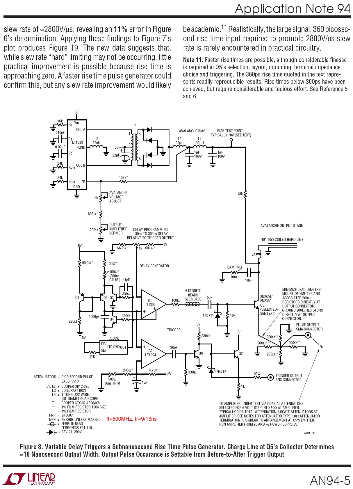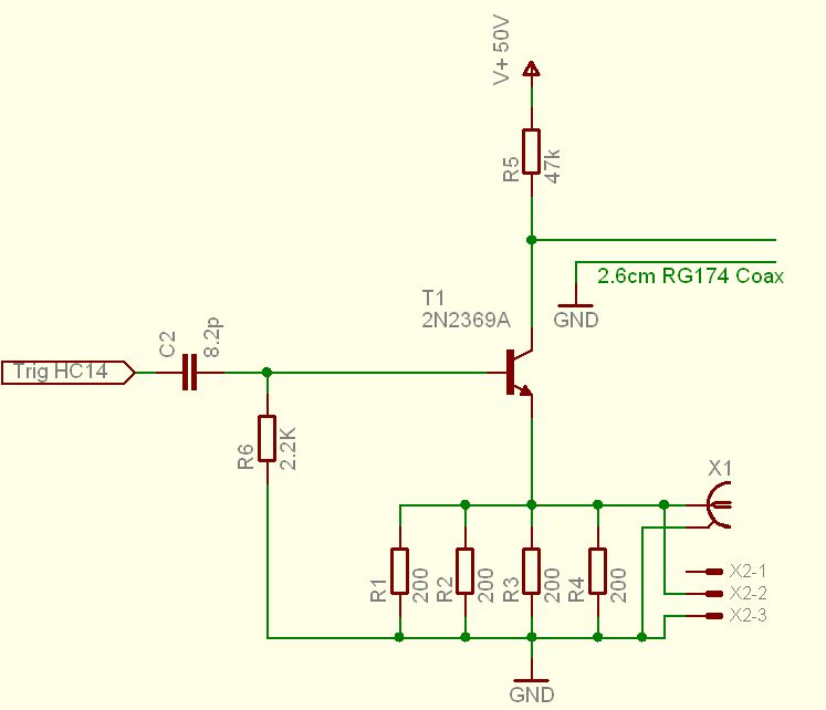 >Meine Schaltung sieht genau wie im Anhang aus bis auf die Diode am Eingang, Würd ich fürs Erste auch weglassen (dient nur um die neg. Halbwelle des HP kurzzuschliessen) >Kondensator und Widerstand am Kollektor.... Den "Damping" Teil würd ich auch weglassen. Die scheinen hier mit einem "sehr" langen Coaxstub (40" =101cm = ~5ns Pulsdauer !) zu arbeiten. Die 10pF wären sowieso viel zu gross, denn die 2.6cm bei mir haben selbst nur ~2.6pF. > L4, keine Ahnung was die damit bezwecken wollen, würd ich auch weglassen.