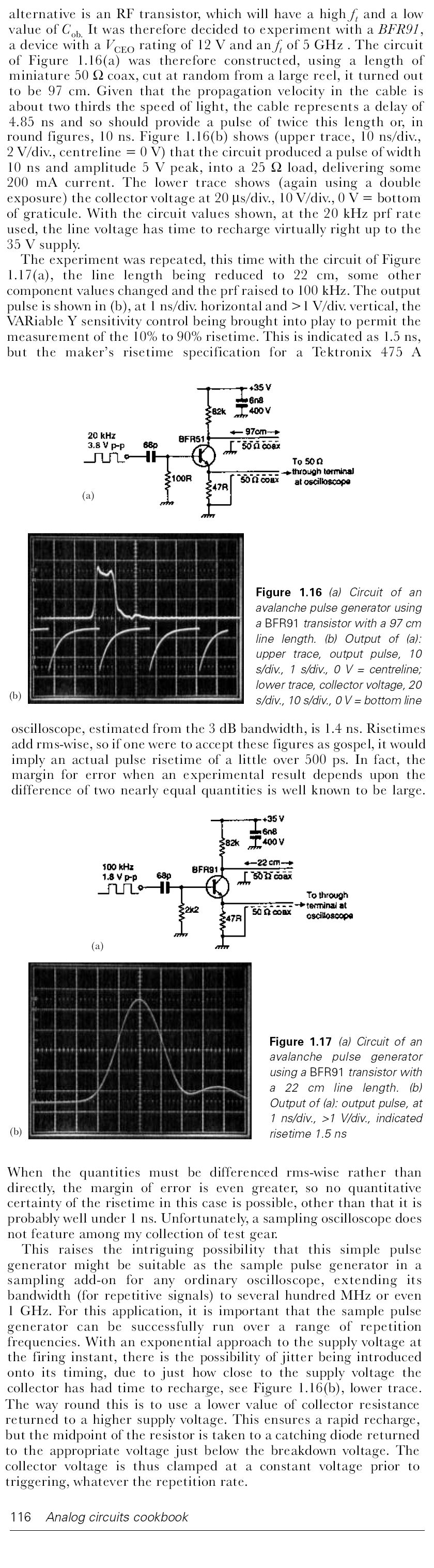 >Oszi 1GHz Du hast also eine durchgehende Analog BW von 1GHz und gehst ohne Probe mit einem Koaxkabel direkt in dein Scope? (nicht dass wir hier durch die Limitierung durch dein Oszi in die Irre geführt werden). Ich hab die starke Vermutung, dass du eine parasitäre Induktivität im Avalanche Stromkreis hast, die dir den Stromanstieg limitiert und dann auch die gedämpfte Schwingung nach dem Puls produziert. Jeder mm ist da bei den Freq. eine Katastrophe. Löte den Koaxstummel+Transistor+50Ohm Abschluss direkt auf denen Koaxanschluss. Dann sollte auch nix mehr klingeln. >50V am Collector Du kanst ruhig probeweise noch weit höher gehen, der Trans. sollte durch die 47K am Kollektor geschützt sein. Wenn der Avalanche Durchbruch einsetzt siehst du auf dem Oszi einen signifikanten Amplitudenanstieg. >3V Selbst wenn du ein 1GHz Oszi hast, wirst du die wahre Amplitude nicht sehen. Mach dir mit einer schnellen Schottky (BAT62, o.ä.GHz Dioden) einen Peak Detektor und miss darüber die Apmlitude. Solang du unter der Amplitude des Triggger Signals bist, hat da noch nichts gezündet. Eventuell probier mehrere Transistoren durch, kann sein dass nicht jedes Exemplar gleich gut geeignet ist. >10 kHz Rechteck Die max. Trig. Frequenz ist nur durch die Zeit Limitiert bis der Coax Stub wieder Aufgeladen ist. >Hochpaß am Collector 1p mach zuerst einen etwas grösseren Kond. rein bis es sicher zündet und taste dich dann nach unten.