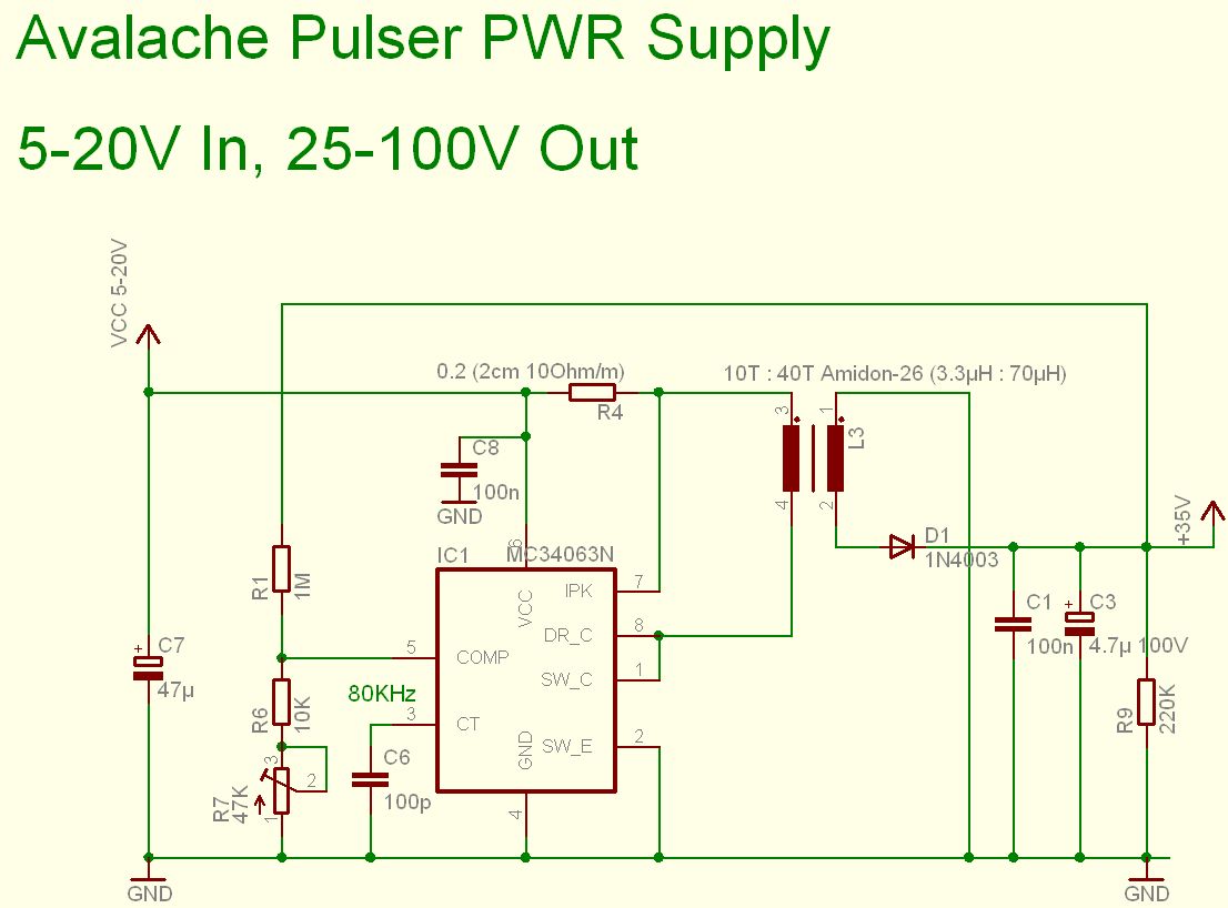 >wir können nicht 100% der Avalanche Pulser Schlatung von Re: >ultrakurzer LED Blitz verstehen. Die Schaltung ist wirklich so simpel wie gepostet und besteht aus drei Teilen: Power Supply, Avalanche Pulser und Trigger. Der Trigger ist ist ein RC Oszillator auf HC14 Basis und läuft auf ein paar kHz - ziemlich simpel, davon gibts noch nicht mal einen Schaltplan. Die Avalanche Power Supply ist auch nichts aufregendes. Sie stellet eine einstellbare Spannung von 25-100V für den Durchbruch zur verfügung. Der Pulser selbst ist auch die einfachste Form die man sich vorstellen kann. Am Eingang einen Hochpass zur Einkopplung des Triggers. Entscheident ist neben der Auswahl eines geeigneten Transistors die Koaxleitung die die Avalanch Energie speichert und deren Länge die Breite des Pulses bestimmt. Die Spannung wird so eingestellt, dass ohne Trigger gerade kein Durchbruch stattfindet. Avalache Transistor: kann ich nicht viel zu sagen, einfach ausprobieren, Hochstromtypen mit fT>=1GHz gingen am besten, aber z.B. ein eher langsamer 2N2369 war besser als ein BFR93A, aber wie gesagt mir fehlt das notwendige Equipment um das wirklich beurteilen zu können. Zetex hat ein paar A. Transis.