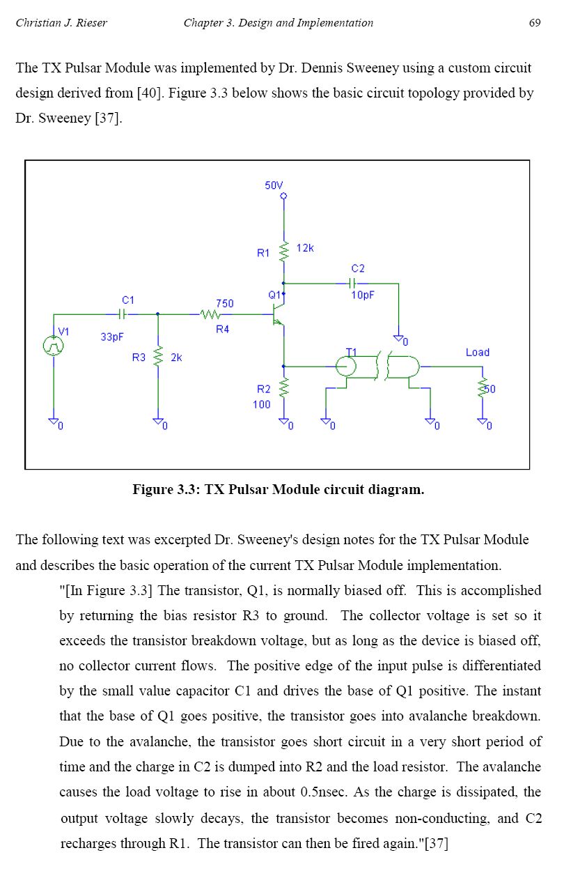 >Unser Problem liegt daran, dass wir eine Schaltung entwickeln (finden) >die ein Monocycle Signal erzeugt. >Diese Schaltung (Beitrag "Re: ultrakurzer LED Blitz") >erzeugt aber kein Monocycle Signal Ich versteh nicht ganz wo denn da das Problem liegt. In dem Han Nguyen pdf werden doch alle Bestandteile des Verfahrens beschieben: Gausspuls erzeugen, Puls Shaping, Differenzieren mittels HP bzw. in [5] addition zweier gegenphasig zeitverschobener Gausspulse. Ob ich den Gausspuls mittels SDR oder über einen Avalanche Durchbruch erzeuge ist doch erst mal zweitrangig, bzw. einfach eine Frage der jeweils damit erzeugbaren Pulsbreiten. Die Weiterverarbeitung ist doch davon unabhängig. Ich hab die beiden Methoden aus dem pdf einfach mal mit meinem Avalanche Pulser ausprobiert. Allerdings fehlt mir das Equipment um zu sehen wie kurz die Pulse tatsächlich sind. Mit einem Tek2445B (200MHz) sehe ich nur noch die verschmierte Sprungantwort des Scopes selbst. (der 25mm Short Stub erzeugt den gegenphasig zeitverschobenen Gausspulse mit einer Peak-Peakseparation von 250ps) Also bevor ich da Wochenlang nach einer geeigneten SDR suche, würde ich doch ganz einfach mal mit einem Avalanchepulser Anfangen und schauen wie weit man kommt. Ich kann mich dunkel erinnern, dass in der Literatur von ~25-200ps Pulsen berichtet wird. (Meinen Pulser hab ich an einem Wochenende auf Lochraster und CuLack Verdrahtung mit Bauteilen aus der Restekiste aufgebaut, also alles halb so wild)