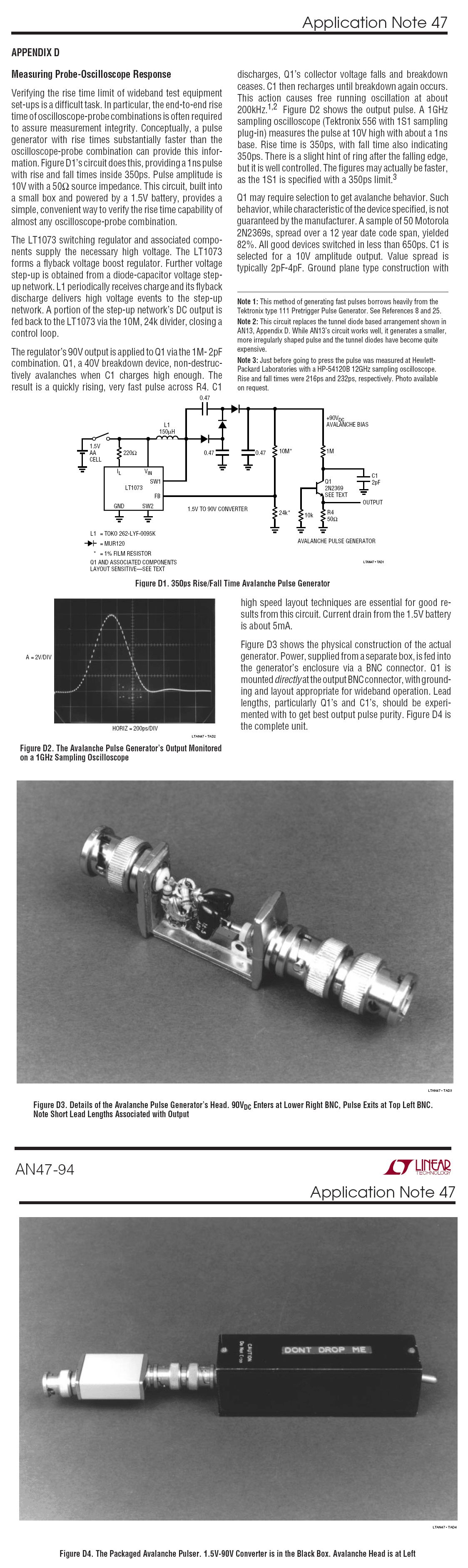 Hallo Michi, kannst du vielleicht doch noch mal ein Bild von deinem Aufbau nachliefern? Wieso? Folgendes, ich habe die Schaltung (AN47 mit LT1073 DC/DC-Konverter) jetzt zweimal aufgebaut. Der Aufbau ist vollständig in SMD (2N2369A von Fairchild in SOT23) und direkt auf einer BNC-Kupplung realisiert. Aufbau 1 beinhaltet zwei parallel geschaltete 1pF/200V NP0 Keramikkondensatoren, Aufbau zwei hat ein Stück SemiRigid verpasst bekommen. Gemessen wurde mit 20dB-Dämpfungsglied vor dem Skope, da die kleinste vertikale Ablenkung 1V/div ist und der Peak nicht vollständig auf den Bildschirm passen würde. Ich plane noch einen dritten Aufbau mit Glimmerkondensator, um der Problematik weiter auf die Spur zu kommen, allerdings wird es noch ein paar Tage dauern, bis ich die Glimmerkondensatoren hier habe. Daher wollt ich das gerne in der Zwischenzeit mit euch/dir diskutieren. Ich überlege nun also woran es liegen könnte, dsas die fallende Flanke bei mir nicht so sauber heraus kommt, denn auch bei Jim Williams sieht der Peak ziemlich symmetrisch aus. Dazu folgendes Bild im Anhang. Trace R1 ist der Aufbau mit Keramikkondensator, Trace 1 der Aufbau mit SemiRigid. Ich habe gesehen, dass deine Pulslänge, gemessen am Tek2445B, etwa 3ns beträgt, im Vergleich dazu zeigt meine Messung eine Pulslänge von etwa 600ps, die Messung von Jims Aufbau ca. 800ps. Sieht dein Puls nur so sauber aus weil dein Scope nicht hinterher kommt? Liegt es daran, dass du eine deutlich größere Kapazität verbaut hast und dieser Effekt nur bei zu kleinen Kapazitätswerten zu beobachten ist oder wirkt hier etwa die BNC-Buchse selbst als Störer? Jim schrieb ja explizit: "...Lead lengths, particularly Q1’s and C1’s, should be experimented with to get best output pulse purity..." Bisher hieß es in dieser Runde hier, Leitungslängen so kurz wie möglich halten, um Induktivitäten im Avalanche-Kreis minimal zu halten. Noch kürzer geht mit SMD an SMD nun wirklich nicht mehr. Bei Bedarf kann ich natürlich noch ein Bild meines Aufbaus hinterher liefern. branadic
