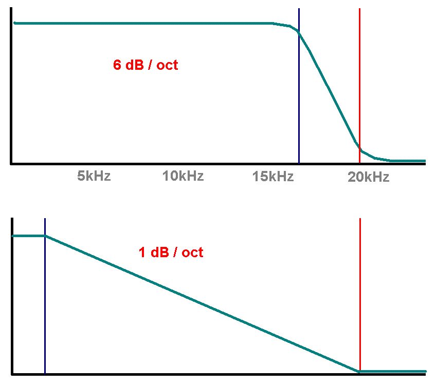 Ich möchte einen weichen Tiefpass mit einem sehr geringen Abfall bauen. Wie liesse sich z.B. der in der Grafik angedeutete TPF möglichst einfach nachempfinden? Üblicherweise würde man bei einem FIR-Filter die Koeffizienten per Integration finden, hierbei sicher dadurch, dass man beim Integranten eine entsprechende Gewichtung / also eine Abhängigkeit mit der Frequenz einführt, wobei zu klären wäre, ob das analytisch lösbar ist. Wahrscheinlich müsste man die Geraden durch etwas anderes ersetzen, um es lösen zu können. Ich kann allerdings diesen Weg nicht gehen, weil ich einen IIR-Filter einsetzen möchte. Diese haben als einstufige Version bekannlich 6dB pro Oktave Abfall der Ampltude, bzw 20dB / Oktave. Wie kann ich den so bauen, dass er z.B. nur 1dB/oct hat?